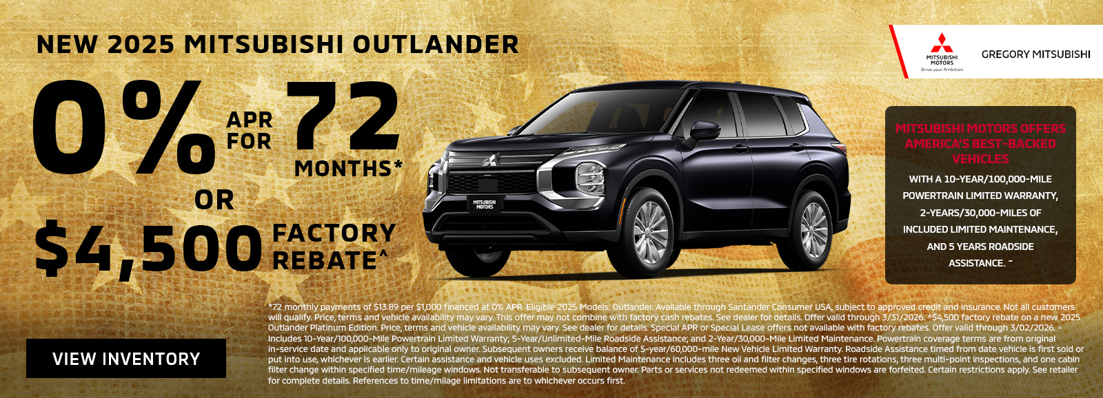 New Vehicle Limited Warranty covers all of the parts in your new Mitsubishi for 5 years or 60,000 miles, with the exception of the battery, tires, air conditioner refrigerant, light bulbs and select entertainment/navigation system components, which carry their own warranties. If any covered part fails during the coverage period, it will be repaired or replaced at an authorized Mitsubishi dealer or service center using genuine Mitsubishi parts.