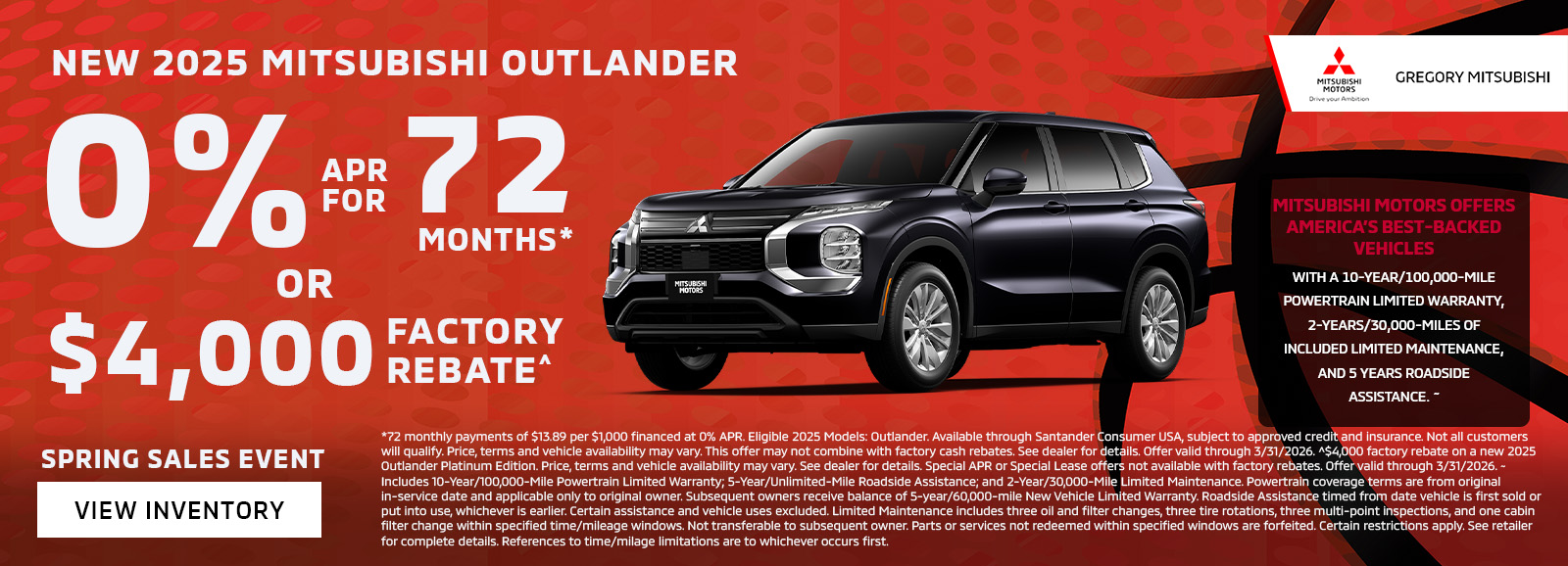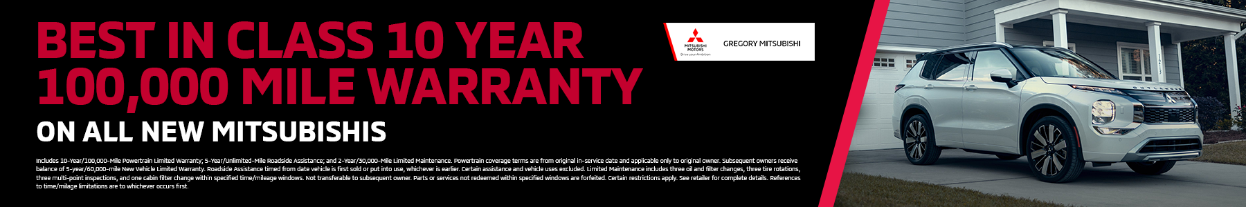 Powertrain Limited Warranty covers the repair or replacement of select engine, transmission and transaxle powertrain components originally manufactured and installed by Mitsubishi that may become defective under normal use and maintenance, along with authorized Mitsubishi powertrain components installed by an authorized Mitsubishi dealer. Coverage is for 10 years or 100,000 miles for most models.